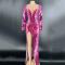 This high split dress has long sleeves, a collar round on the front but wide on the back. It is skincolor and tranparent. The cheast is clean while other parts are filled with mirror- like silver sequins in the same color of the dress and they make it shiny.