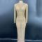 This long dress has long sleeves and the collar is high on the front but wide on the back. Rhinestones decorated on it are in the same color with the dress and designed into stripes on the sleeves, cheast and hemline and waves on the waist and neck.