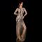 This shiny dress has a round collar, long sleeves and a floor length. It is nude on the top half and decorated with silver sequins on the arms and side of body. There are black and whithe rhinestones consist into rectangle and square decorating from shoulder to cuff, or waves on the cheast and waist. The half bottom is transparent, and also filled with sparkly sequins while they are denser.