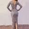 This long dress has long sleeves and a nude backcolor. The collar is high on the front but wide on the back. It is filled with geometric figure printed, such as square, rectangle, triangle and some irregular figures and so on. It is also decorated with silver sparkly rhinestones, and they make it shiny.