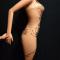 This short dress is nude, sleeves, shoulder-off and backless, simple but elegant. It is decorated with sparkly gold and silver rhinestones. They are desinged into different pattern like necklace on the neck, scallop on the breast, branches and leaves on the waist and totem on the hip.