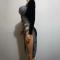 This gorgeous dress has a black backcolor, a wide collar and long sleeves. It is backless and high-splited. Also the hollow- carved design can show off waist. The dress is decorated with sparkly rhinestones and pearls. They fill the breast, and along edge from shoulders to hemline. They make the dress shiny, modest but luxury.