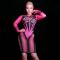 This dress is in pretty rose red. It has long sleeves and a collar round on the front but wide on the back. There are black pattern printed on the cuff and top half of body with sparkly rhinestones in the same color. The hemline is black and hollowed- out. The carved parts are decorated with rose red lace tied up like shoes.
