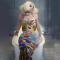This dress is skincolor in cheast, yellow in waist and printed with Madonna in hemline. It is sleeveless and has a round collar. There are various pattern printed and decorated with sparkly rhinestones in the same color of them. Pattern of Virgin Mary are delicate and decorated with pure pearls, too. They are arranged on the edge with waves that spread out in a circle like halo.