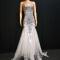 This floor- length dress is sleeveless and has a high collar. It is skincolor from neck to cheast, grey from breast to hip, then hemline is made of white transparent plicated tulle. There are silver jewels derocated on breast and waist in shape of flower with sparkly rhinestones arranged as leaves and cirrus, and they make the dress shiny.