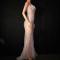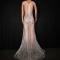 This dress has a wide collar and floor length. It is shoulder- off, sleeveless and transparent white. It is filled with multi- color sparkly rhinestones on breast, waist and hip with silver ones interspersed edge in radial like sun, and they make the dress colorful and shiny.