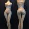 This bodysuit is skincolor and sleeveless. There are black rhinestones arranged in grid lines decorated on breast and hip as brassiere and shorts. And silver sparkly ones on waist and leg, they make this bodysuit stratified and shiny.