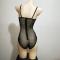 This slip leotard is black and transparent. There are multi- color sparkly rhinestones and pearls decorate it. They are dense in breast and middle of body while spare on the side and back, and they make it shiny and colorful.