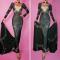 This long trailing dress is black. It has long sleeves and a high collar. It is skincolor in cheast that make it looks like breast bared. There are multi- color sparkly rhinestones decorate neck, body, sleeve, hemline and tail in array and they make the whole dress shiny and colorful.