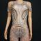 This bodysuit is skincolor, shoulder- off and sleeveless. It has a collar round in front but wide in back with sequins fringed. In fact it is decorated with silver sparkly sequins, rhinestones and white pearls from top to bottom. They group together and constitute different patterns like arch, triangle, wave and so on. And they make this cloth shiny and elegant.