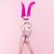 They are all made of white transparent lace with delicate pattern that make it elegant. The shirt is sleeveless and backless, it has a high collar connected with headgear. And the shorts are connected with waist by pink bandage. These pink pu leather are also decorate edges, neck and breast and make the whole cloth bright.