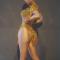 It is totally skincolor, it has long sleeves and a collar high in front but wide in back. There are gold/ silver sparkly rhinestones decorate it densely in shouders, cuffs and breast. They are arranged in delicate pattern like flower and looks like a waistcoat. They also decorate around waist like a belt and make the whole cloth shiny. Gold/ silver tassels fringe waist that constitute a hemline.