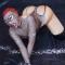The leotard and headwear are skincolor with black grid and chiain printed. The brassiere and shoecover are made of patent leather that sparkly under light. The overcoat is very loose and constituted by red, black and white plicate tulle.