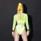 This transparent laciness leotard is totally fluorescent green. It has a very wide collar and long sleeves. It is backless and hollow- outed in sides of waist. There are irregular silver sparkly rhinestones decorate it from top to bottom and make the cloth shiny.